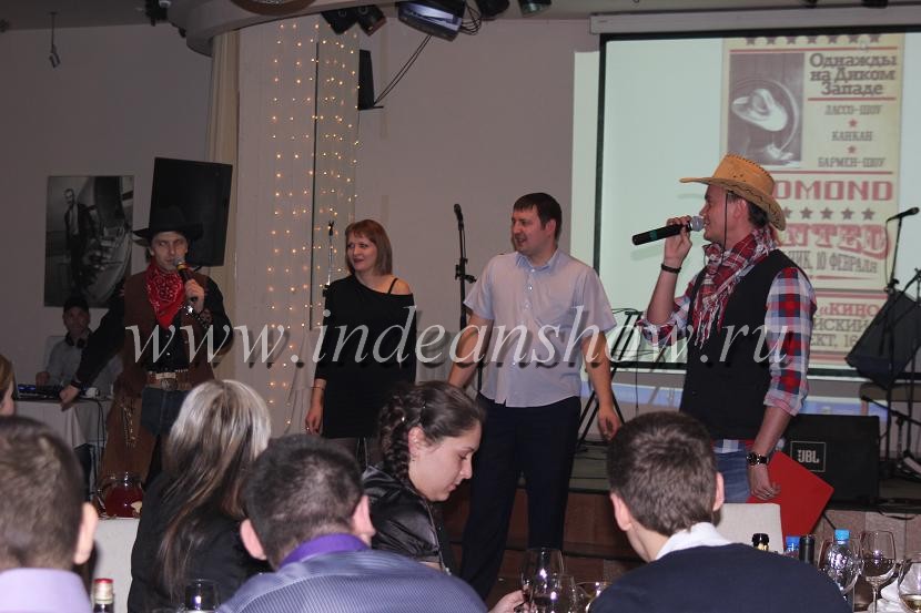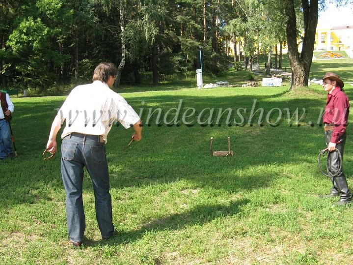 Во время наших выступлений в ковбойском стиле мы также организуем программу конкурсов, стрельбы из луков, арбалетов, пневматических стилизованных ружей и исторических револьверов, метания ножей, томагавков, копий и, конечно, настоящего ковбойского лассо, проводим викторины на индейскую и ковбойскую темы.